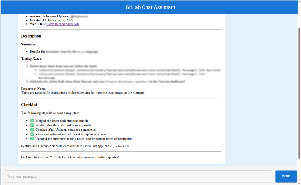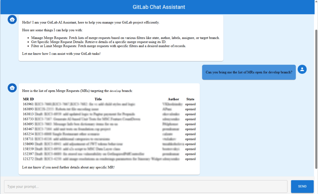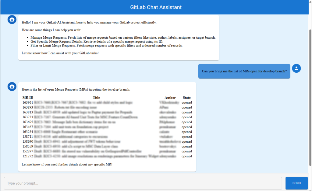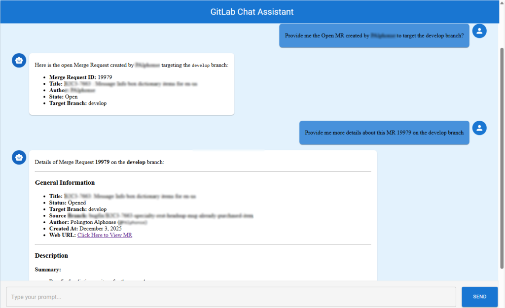 A GenAI-powered solution that lets users interact with GitLab using natural language, making tasks like fetching merge requests, generating reports, and exploring project data as easy as chatting with a colleague.