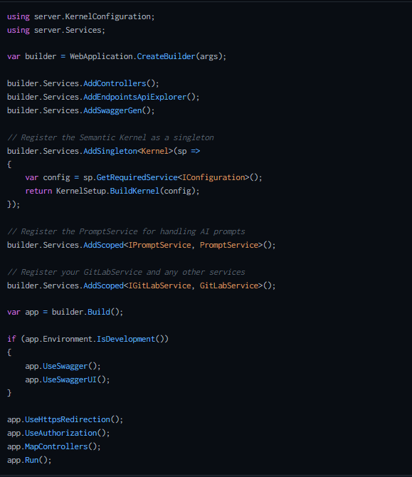 Semantic Kernel is Microsoft’s orchestration library for integrating Large Language Models (LLMs) with your own code and data. In this project, it acts as the “brain” that interprets user prompts, decides which functions (plugins) to call, and combines AI-generated text with real GitLab data.