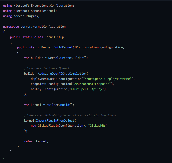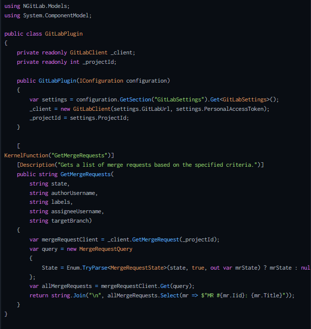 Here’s a concise, illustrative snippet from your GitLabPlugin that shows how a Semantic Kernel function is exposed to the AI: